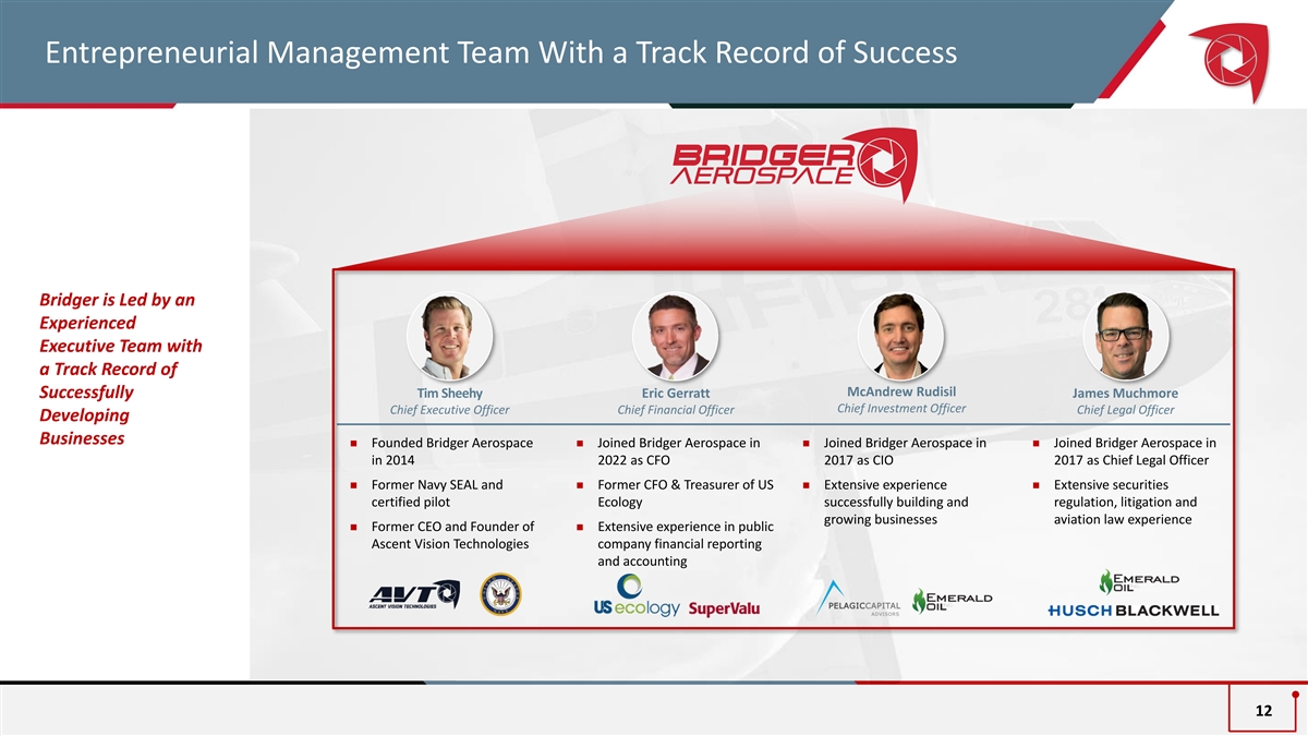 Bridger’s Critical Mission Bridger’s Mission is to Fight Wildfires that Cause Hundreds of Billions of Dollars of Economic Damage and Emit Hundreds of Millions of Metric Tons of CO into the 2 Mitigate economic Minimize Directly attack CO Atmosphere Annually 2 loss as wildfire environmental harm emissions to combat severity, frequency and through eco-friendly climate change damage rises and sustainable firefighting methods Source: AccuWeather, Bankrate, ABC10 and CalMatters. 11