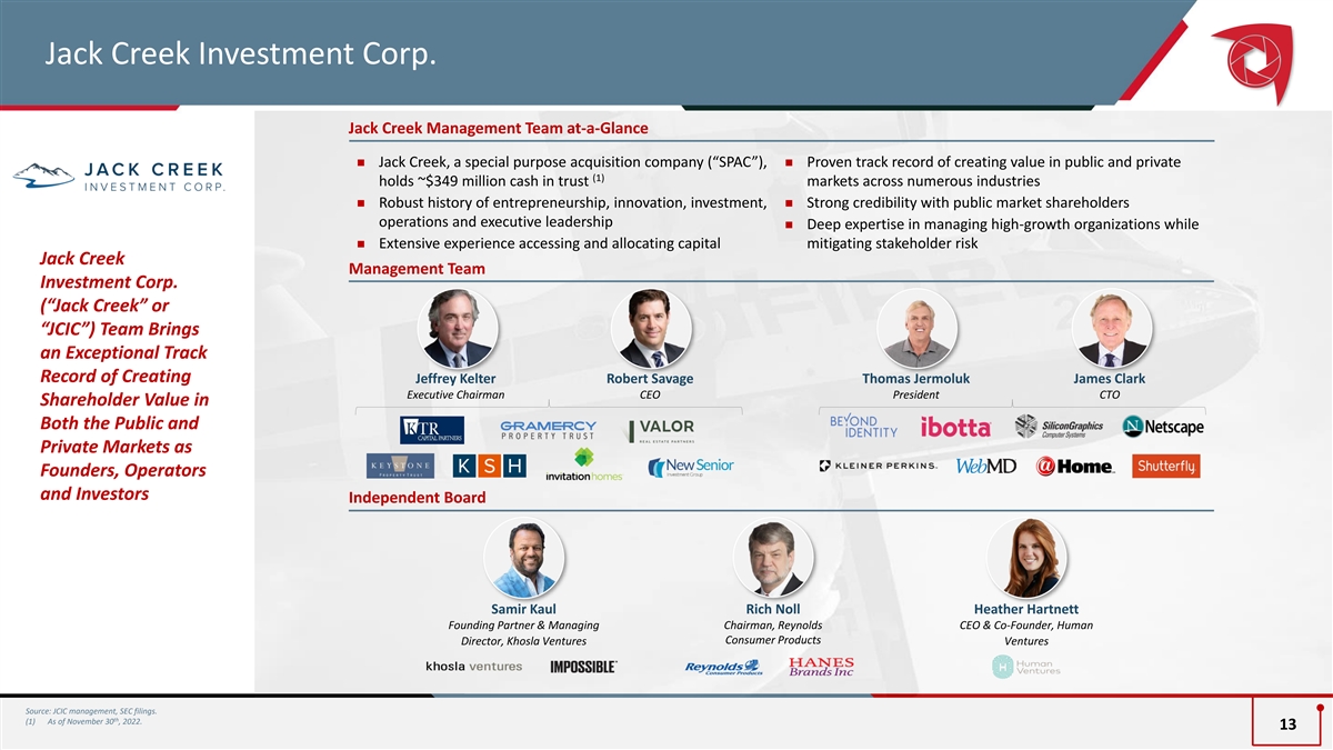 Jack Creek Investment Corp. Jack Creek Management Team at-a-Glance ◼ Jack Creek, a special purpose acquisition company (“SPAC”), ◼ Proven track record of creating value in public and private (1) holds ~$349 million cash in trust markets across numerous industries ◼ Robust history of entrepreneurship, innovation, investment, ◼ Strong credibility with public market shareholders operations and executive leadership ◼ Deep expertise in managing high-growth organizations while ◼ Extensive experience accessing and allocating capital mitigating stakeholder risk Jack Creek Management Team Investment Corp. (“Jack Creek” or “JCIC”) Team Brings an Exceptional Track Record of Creating Jeffrey Kelter Robert Savage Thomas Jermoluk James Clark Executive Chairman CEO President CTO Shareholder Value in Both the Public and Private Markets as Founders, Operators and Investors Independent Board Samir Kaul Rich Noll Heather Hartnett Founding Partner & Managing Chairman, Reynolds CEO & Co-Founder, Human Consumer Products Director, Khosla Ventures Ventures Source: JCIC management, SEC filings. th (1) As of November 30 , 2022. 13