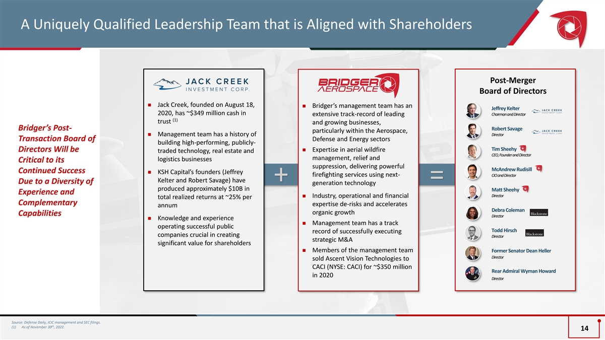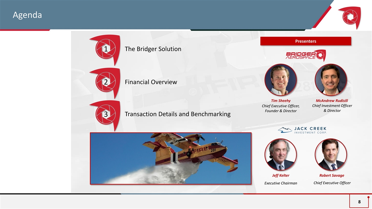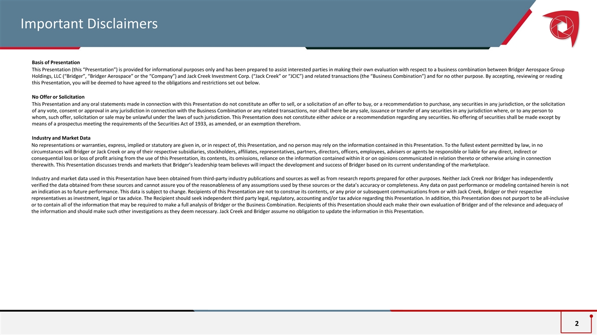 Important Disclaimers Forward Looking Statements Certain statements included in this Presentation are not historical facts but are forward-looking statements, including for purposes of the safe harbor provisions under the United States Private Securities Litigation Reform Act of 1995. Forward-looking statements generally are accompanied by words such as “believe,” “may,” “will,” “estimate,” “continue,” “anticipate,” “intend,” “expect,” “should,” “would,” “plan,” “project,” “forecast,” “predict,” “potential,” “seem,” “seek,” “future,” “outlook,” “target,” and similar expressions that predict or indicate future events or trends or that are not statements of historical matters, but the absence of these words does not mean that a statement is not forward- looking. These forward-looking statements include, but are not limited to, (1) references with respect to the anticipated benefits of the Business Combination and anticipated closing timing; (2) the sources and uses of cash of the Business Combination; (3) the anticipated capitalization and enterprise value of the combined company following the consummation of the Business Combination; (4) current and future potential commercial and customer relationships; and (5) anticipated investments in additional aircraft, capital resource, and research and development and the effect of these investments. These statements are based on various assumptions, whether or not identified in this Presentation, and on the current expectations of JCIC’s and Bridger’s management and are not predictions of actual performance. These forward-looking statements are provided for illustrative purposes only and are not intended to serve as, and must not be relied on by any investor as, a guarantee, an assurance, a prediction or a definitive statement of fact or probability. Actual events and circumstances are difficult or impossible to predict and will differ from assumptions. Many actual events and circumstances are beyond the control of JCIC and Bridger. These forward-looking statements are subject to a number of risks and uncertainties, including: changes in domestic and foreign business, market, financial, political and legal conditions; the inability of the parties to successfully or timely consummate the Business Combination, including the risk that any required stockholder or regulatory approvals are not obtained, are delayed or are subject to unanticipated conditions that could adversely affect the combined company or the expected benefits of the Business Combination is not obtained; failure to realize the anticipated benefits of the Business Combination; risks relating to the uncertainty of the projected financial information with respect to Bridger; Bridger’s ability to successfully and timely develop, sell and expand its technology and products, and otherwise implement its growth strategy; risks relating to Bridger’s operations and business, including information technology and cybersecurity risks, loss of requisite licenses, flight safety risks, loss of key customers and deterioration in relationships between Bridger and its employees; risks related to increased competition; risks relating to potential disruption of current plans, operations and infrastructure of Bridger as a result of the announcement and consummation of the Business Combination; risks that Bridger is unable to secure or protect its intellectual property; risks that the post-combination company experiences difficulties managing its growth and expanding operations; the ability to compete with existing or new companies that could cause downward pressure on prices, fewer customer orders, reduced margins, the inability to take advantage of new business opportunities, and the loss of market share; the amount of redemption requests made by JCIC’s shareholders; the impact of the COVID-19 pandemic; the ability to successfully select, execute or integrate future acquisitions into the business, which could result in material adverse effects to operations and financial conditions; and those factors discussed in the Appendix to this Presentation and set forth in the section entitled “Risk Factors” and “Special Note Regarding Forward‐Looking Statements” in Jack Creek’s Quarterly Report on Form 10‐Q for the quarter ended September 30, 2022, Jack Creek's Annual Report on Form 10‐K for the year ended December 31, 2021, and the registration statement on Form S-4, as amended, initially filed on August 12, 2022 by Wildfire New PubCo, Inc., a wholly-owned subsidiary of Jack Creek (“New PubCo”), and declared effective by the U.S. Securities and Exchange Commission (the SEC ) on December 16, 2022 (the Registration Statement ), as well as in those documents that Jack Creek and New PubCo, has filed, or will file, with the SEC. If any of these risks materialize or our assumptions prove incorrect, actual results could differ materially from the results implied by these forward-looking statements. The risks and uncertainties above are not exhaustive, and there may be additional risks that neither JCIC nor Bridger presently know or that JCIC and Bridger currently believe are immaterial that could also cause actual results to differ from those contained in the forward-looking statements. In addition, forward looking statements reflect JCIC’s and Bridger’s expectations, plans or forecasts of future events and views as of the date of this Presentation. JCIC and Bridger anticipate that subsequent events and developments will cause JCIC’s and Bridger’s assessments to change. However, while JCIC and Bridger may elect to update these forward-looking statements at some point in the future, JCIC and Bridger specifically disclaim any obligation to do so. These forward-looking statements should not be relied upon as representing JCIC’s and Bridger’s assessments as of any date subsequent to the date of this Pr