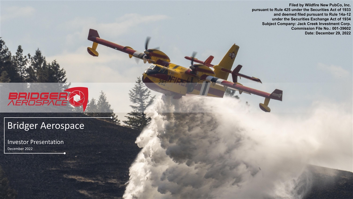 Filed by Wildfire New PubCo, Inc. pursuant to Rule 425 under the Securities Act of 1933 and deemed filed pursuant to Rule 14a-12 under the Securities Exchange Act of 1934 Subject Company: Jack Creek Investment Corp. Commission File No.: 001-39602 Date: December 29, 2022 Bridger Aerospace Investor Presentation December 2022