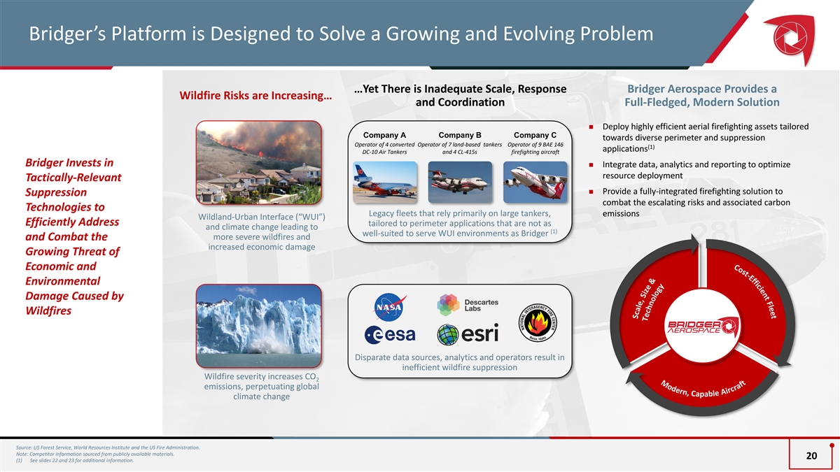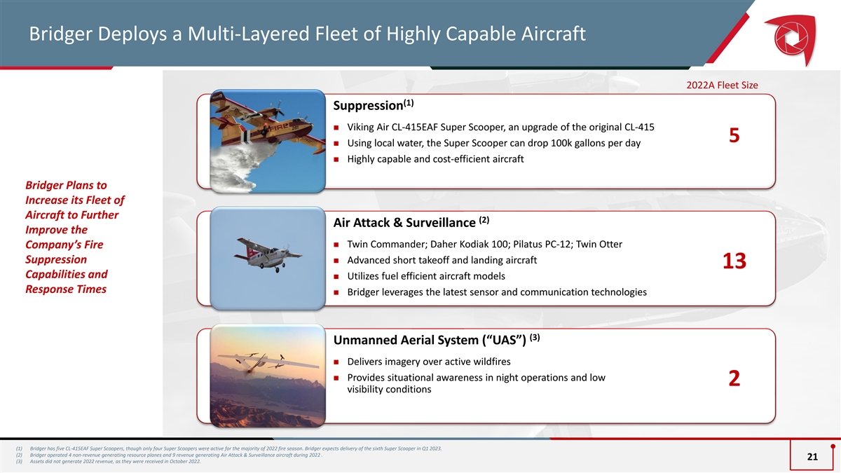 Large Market With Strong Demand for Air-Based Suppression Technologies Aerial Suppression Spend Represented ~43% … and the Market is Anticipated to Continue to Expand (1) of the $22 Billion Firefighting Market in 2021 … as Wildfires Rage Across Europe and the US Air-Based (3) Suppression Greece Faced a Disaster Wildfires Raged Across Wildfires Ravaged Across COCO of Unprecedented Southern Italy as Its Alaska with 264 Active Federal and State Proportion Rivers Dried Up Individual Fires $5.8 bn Agencies Have $9.5 bn Become Increasingly (4) (2) $0.3 bn Ground GOCO Motivated to Outsource Aerial (2) $3.2 bn GOGO Firefighting to More Effectively Combat $3.1 bn the Increasing (5) Data Presence and Intensity of Wildfires ▪ There is a rapidly growing need globally for fire suppression ▪ These events represent Summer 2022 wildfires and emphasize the assets need for increased wildfire suppression resources globally ▪ The shift away from ground towards more air-based suppression ▪ In traditional wildfire areas, wildfire intensity and duration are has already commenced increasing, and total wildfire impact is spreading into new regions as global temperatures rise ▪ Unfulfilled requests for fixed wing aircraft for aerial firefighting grew at a compound annual growth rate of 8.1% between 2002 and 2021, resulting in 1,254 unfulfilled requests in 2021 Source: National Interagency Coordination Center, CNN, CBS, The Guardian and Bridger management estimates. (1) Bridger management defines the global firefighting market as the sum of the air-based suppression, ground, and fire data, aerial imagery-related, and emergency mobile application markets. (2) GOCO: Government Owned and Contractor Operated; GOGO: Government Owned and Government Operated. (3) Based on the global aerial firefighting market size from the June 2021 Verified Market Research report and an industry estimate of the relative proportion of COCO, GOCO, and GOGO. (4) Based on Bridger management’s estimated $4.3 billion US ground market based on budgeted wildfire expenditures for key federal and state agencies; Bridger management estimated that the US ground market represented approximately 45% of the global ground market. (5) Based on Bridger management’s estimated $0.9 billion US 19 market for the fire data and surveillance-related emergency market based on review of available peer company data; Bridger management estimated that the US fire data and surveillance-related emergency market represented approximately 31% of the global fire data, aerial imagery-related, and emergency mobile application market.