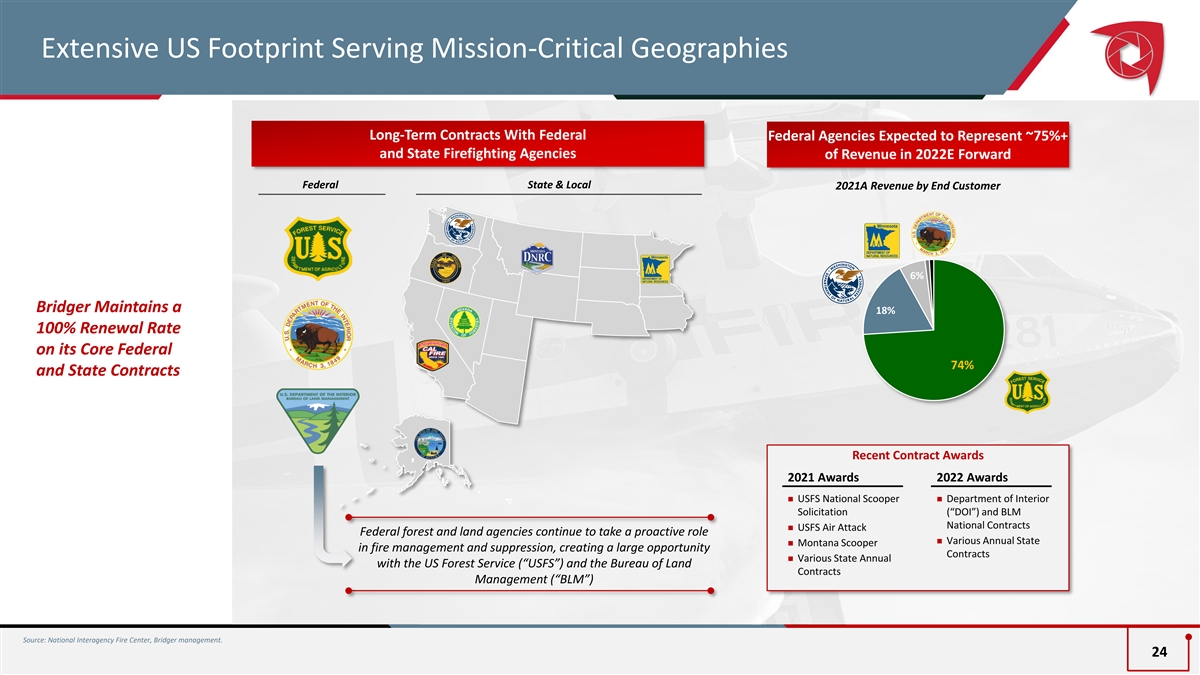 Bridger Delivers More Complete and Effective Fire Suppression Capabilities Illustrative Perimeter (1) Solution Provider Multiple Layers of Aircraft Traditional LAT/VLATs Fleet Type Bridger Offers 35 Fleet Size 20 and Scaling Differentiated 100 Solutions to Combat 150-250 Drop Altitude (Feet) the Evolving (2) (feet) ~100,000 30-50,000 Daily Productivity Challenges of Aerial (Gallons) Firefighting 30 minutes - 1 hour Reload (gallo Time ns) < 1 minute Limited Near Real-time Data FireTrac Data Platform (3) (4) Direct Attack Indirect Attack Use Case “Scoopers are considerably less expensive to own and operate than larger helicopters and fixed-wing airtankers. When fires are near water, scoopers can drop more water than airtankers can drop retardant. At least two-thirds of historical fires have been within ten miles of a scooper-accessible body of water.” Rand Corporation, Air Attack Against Wildfires Source: Bridger management, Viking Air OEM specifications and marketing. (1) Based on comparisons to large air tankers (“LAT”) and very large air tankers (“VLAT”) that primarily drop retardants. (2) Assumes scoopable water is 5 miles away; a Scooper can fly up to 8 hours per day (refueling after four hours) and drop 50,000 gallons per tank of fuel. 23 (3) Indirect Attack platforms are retardant-based and are used to create a fire line, preventing further spread of flames. (4) Direct Attack platforms are water-based and are dropped directly on flames to combat wildfires immediately.