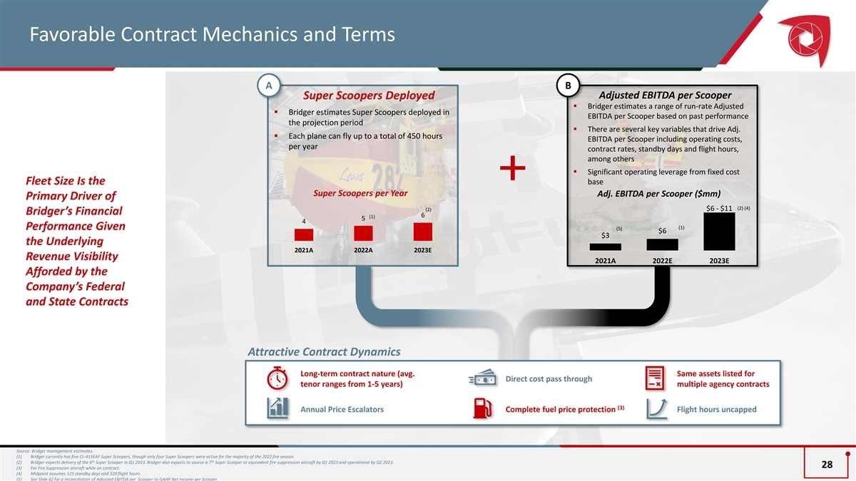 A Longer Active Fire Season is Extending Operators’ Flight Hours Climate Change has Elongated the Active Northern Hemisphere Fire Season Jan Feb Mar Apr May Jun Jul Aug Sep Oct Nov Dec Maintenance, Training & Active Fire Season Maintenance FAA re-certification period (each CL-415EAF has the ability to fly 450 hours during this period) Period 120-day initial 30-day 30-day 30-day extension extension extension task order 90 to 120-day total extension Each contract primarily contains two main revenue components Standby Flight A B (daily rate) (hourly rate) Source: Bridger management. 27