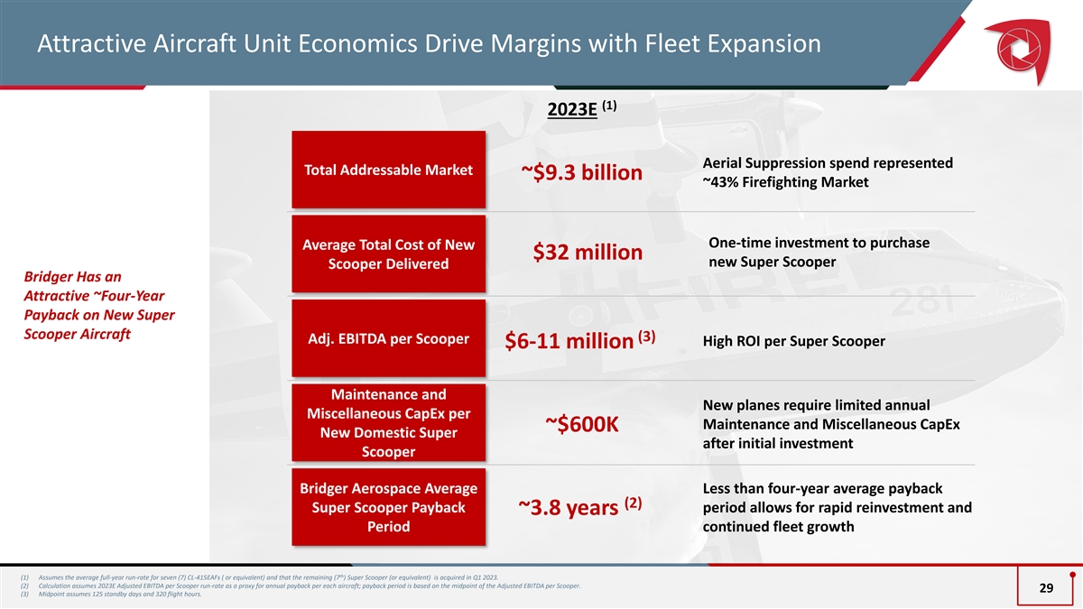 Favorable Contract Mechanics and Terms A B Super Scoopers Deployed Adjusted EBITDA per Scooper ▪ Bridger estimates a range of run-rate Adjusted ▪ Bridger estimates Super Scoopers deployed in EBITDA per Scooper based on past performance the projection period ▪ There are several key variables that drive Adj. ▪ Each plane can fly up to a total of 450 hours EBITDA per Scooper including operating costs, per year contract rates, standby days and flight hours, among others ▪ Significant operating leverage from fixed cost Fleet Size Is the base Super Scoopers per Year Adj. EBITDA per Scooper ($mm) Primary Driver of (2) (4) $6 - $11 (2) Bridger’s Financial 6 (1) 5 4 (1) Performance Given (5) $6 $3 the Underlying 2021A 2022A 2023E Revenue Visibility 2021A 2022E 2023E Afforded by the Company’s Federal and State Contracts Attractive Contract Dynamics Long-term contract nature (avg. Same assets listed for Direct cost pass through tenor ranges from 1-5 years) multiple agency contracts (3) Annual Price Escalators Complete fuel price protection Flight hours uncapped Source: Bridger management estimates. (1) Bridger currently has five CL-415EAF Super Scoopers, though only four Super Scoopers were active for the majority of the 2022 fire season. th th (2) Bridger expects delivery of the 6 Super Scooper in Q1 2023. Bridger also expects to source a 7 Super Scooper or equivalent fire suppression aircraft by Q1 2023 and operational by Q2 2023. 28 (3) For Fire Suppression aircraft while on contract. (4) Midpoint assumes 125 standby days and 320 flight hours (5) See Slide 42 for a reconciliation of Adjusted EBITDA per Scooper to GAAP Net Income per Scooper.