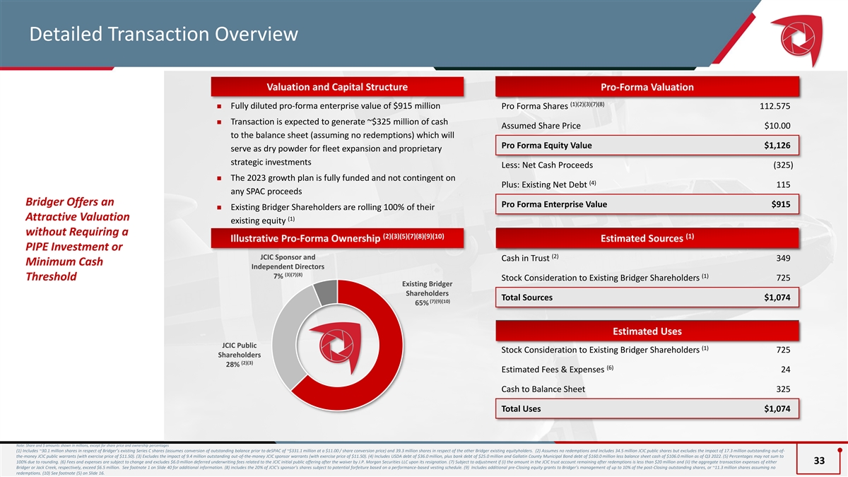 Detailed Transaction Overview Pro Forma Valuation Valuation and Capital Structure Pro-Forma Valuation (1)(2)(3)(7)(8) ◼ Fully diluted pro-forma enterprise value of $915 million Pro Forma Shares 112.575 ◼ Transaction is expected to generate ~$325 million of cash Assumed Share Price $10.00 to the balance sheet (assuming no redemptions) which will Pro Forma Equity Value $1,126 serve as dry powder for fleet expansion and proprietary strategic investments Less: Net Cash Proceeds (325) ◼ The 2023 growth plan is fully funded and not contingent on (4) Plus: Existing Net Debt 115 any SPAC proceeds Bridger Offers an Pro Forma Enterprise Value $915 ◼ Existing Bridger Shareholders are rolling 100% of their Attractive Valuation (1) existing equity without Requiring a (2)(3)(5)(7)(8)(9)(10) (1) Illustrative Pro-Forma Ownership EstimaSour ted Sour ces ces PIPE Investment or (2) JCIC Sponsor and Cash in Trust 349 Minimum Cash Independent Directors (3)(7)(8) (1) 7% Threshold Stock Consideration to Existing Bridger Shareholders 725 Existing Bridger Shareholders Total Sources $1,074 (7)(9)(10) 65% Uses Estimated Uses JCIC Public (1) Stock Consideration to Existing Bridger Shareholders 725 Shareholders (2)(3) 28% (6) Estimated Fees & Expenses 24 Cash to Balance Sheet 325 Total Uses $1,074 Note: Share and $ amounts shown in millions, except for share price and ownership percentages (1) Includes ~30.1 million shares in respect of Bridger’s existing Series C shares (assumes conversion of outstanding balance prior to deSPAC of ~$331.1 million at a $11.00 / share conversion price) and 39.3 million shares in respect of the other Bridger existing equityholders. (2) Assumes no redemptions and includes 34.5 million JCIC public shares but excludes the impact of 17.3 million outstanding out-of- the-money JCIC public warrants (with exercise price of $11.50). (3) Excludes the impact of 9.4 million outstanding out-of-the-money JCIC sponsor warrants (with exercise price of $11.50). (4) Includes USDA debt of $36.0 million, plus bank debt of $25.0 million and Gallatin County Municipal Bond debt of $160.0 million less balance sheet cash of $106.0 million as of Q3 2022. (5) Percentages may not sum to 100% due to rounding. (6) Fees and expenses are subject to change and excludes $6.0 million deferred underwriting fees related to the JCIC initial public offering after the waiver by J.P. Morgan Securities LLC upon its resignation. (7) Subject to adjustment if (i) the amount in the JCIC trust account remaining after redemptions is less than $20 million and (ii) the aggregate transaction expenses of either 33 Bridger or Jack Creek, respectively, exceed $6.5 million. See footnote 1 on Slide 40 for additional information. (8) includes the 20% of JCIC's sponsor's shares subject to potential forfeiture based on a performance-based vesting schedule. (9) Includes additional pre-Closing equity grants to Bridger's management of up to 10% of the post-Closing outstanding shares, or ~11.3 million shares assuming no redemptions. (10) See footnote (5) on Slide 16.