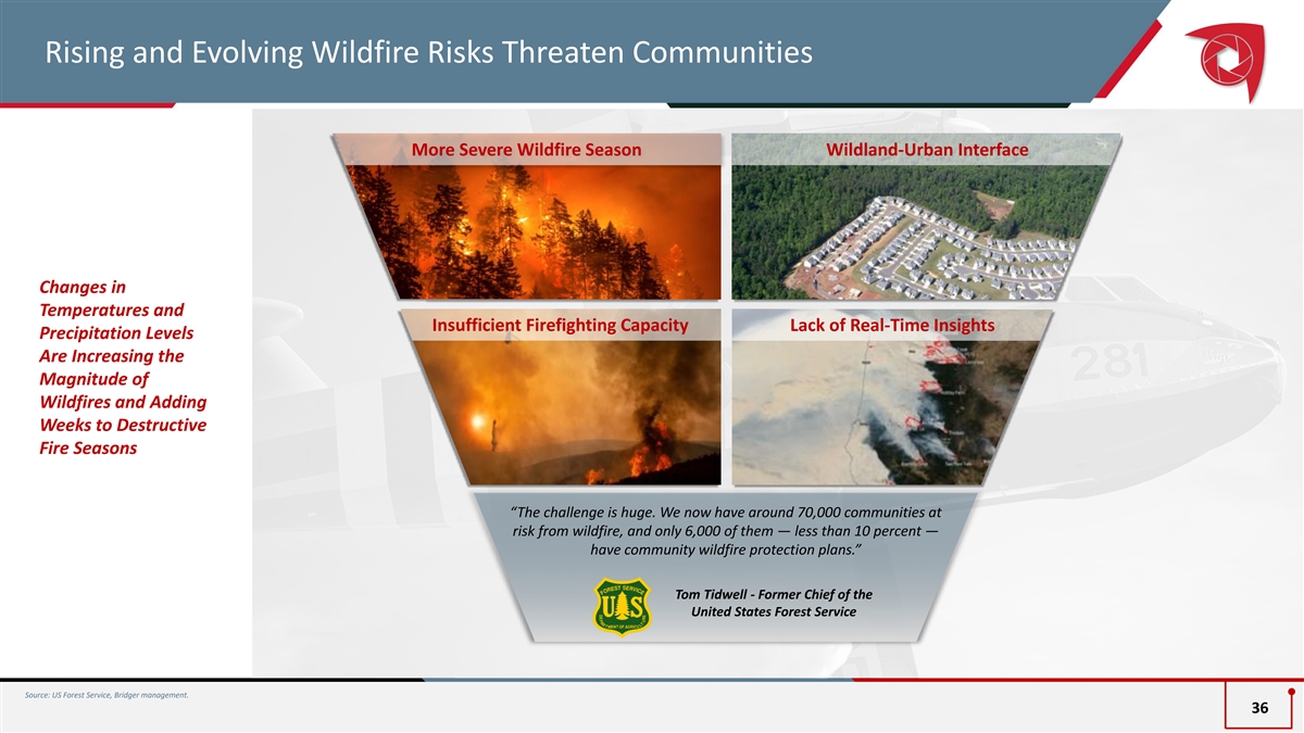 Rising and Evolving Wildfire Risks Threaten Communities More Severe Wildfire Season Wildland-Urban Interface Changes in Temperatures and Insufficient Firefighting Capacity Lack of Real-Time Insights Precipitation Levels Are Increasing the Magnitude of Wildfires and Adding Weeks to Destructive Fire Seasons “The challenge is huge. We now have around 70,000 communities at risk from wildfire, and only 6,000 of them — less than 10 percent — have community wildfire protection plans.” Tom Tidwell - Former Chief of the United States Forest Service Source: US Forest Service, Bridger management. 36