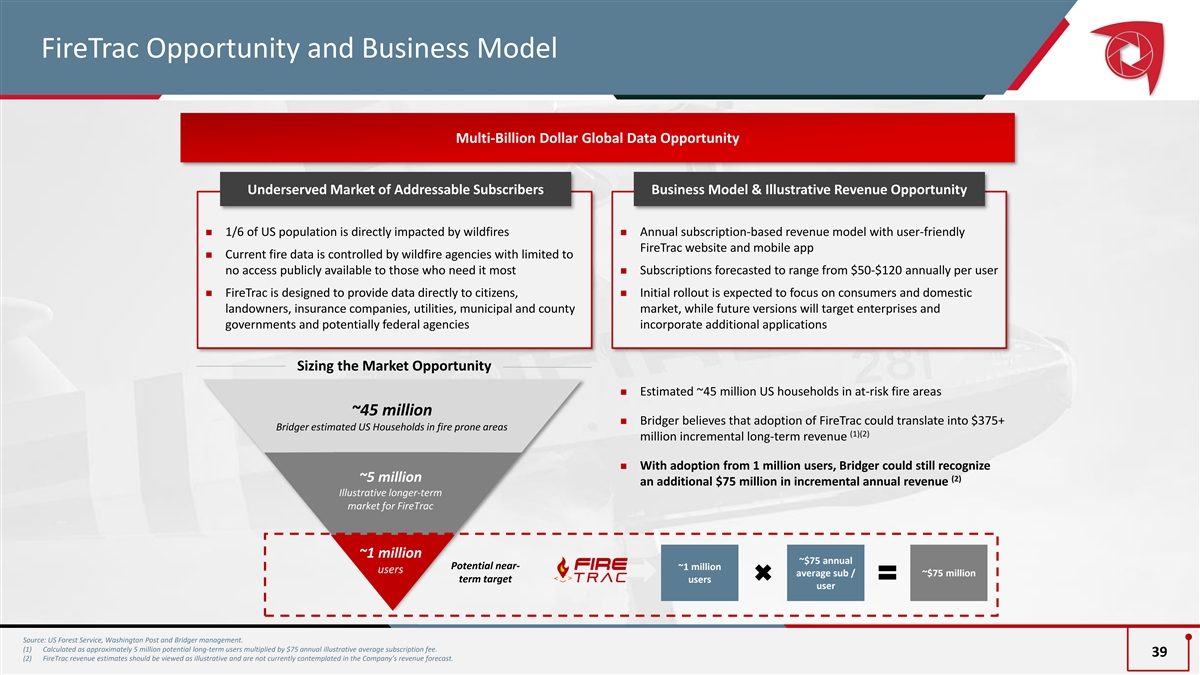 FireTrac Opportunity and Business Model Multi-Billion Dollar Global Data Opportunity Underserved Market of Addressable Subscribers Business Model & Illustrative Revenue Opportunity ◼ 1/6 of US population is directly impacted by wildfires◼ Annual subscription-based revenue model with user-friendly FireTrac website and mobile app ◼ Current fire data is controlled by wildfire agencies with limited to no access publicly available to those who need it most◼ Subscriptions forecasted to range from $50-$120 annually per user ◼ FireTrac is designed to provide data directly to citizens, ◼ Initial rollout is expected to focus on consumers and domestic landowners, insurance companies, utilities, municipal and county market, while future versions will target enterprises and governments and potentially federal agencies incorporate additional applications Sizing the Market Opportunity ◼ Estimated ~45 million US households in at-risk fire areas ~45 million ◼ Bridger believes that adoption of FireTrac could translate into $375+ Bridger estimated US Households in fire prone areas (1)(2) million incremental long-term revenue ◼ With adoption from 1 million users, Bridger could still recognize ~5 million (2) an additional $75 million in incremental annual revenue Illustrative longer-term market for FireTrac ~1 million ~$75 annual Potential near- ~1 million users average sub / ~$75 million term target users user Source: US Forest Service, Washington Post and Bridger management. (1) Calculated as approximately 5 million potential long-term users multiplied by $75 annual illustrative average subscription fee. 39 (2) FireTrac revenue estimates should be viewed as illustrative and are not currently contemplated in the Company’s revenue forecast.