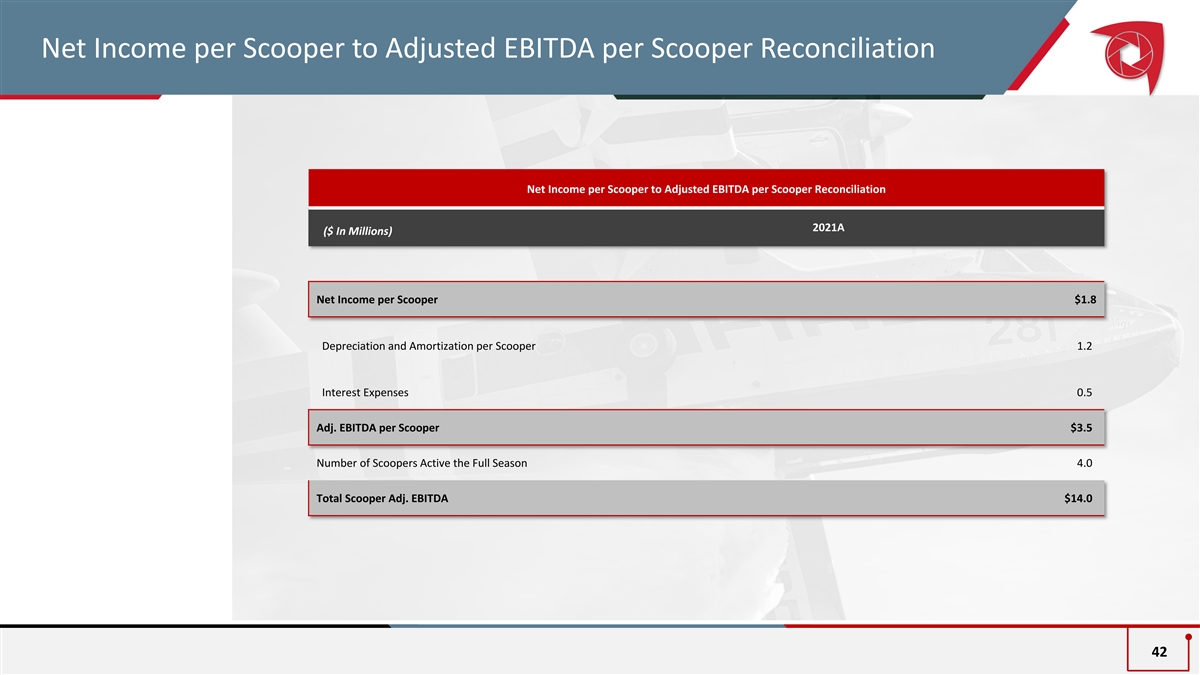 Net Income to Adjusted EBITDA Reconciliation 2021A Net Loss to Adjusted EBITDA Reconciliation Year Ended December 31, 2021 ($ In Millions) Net Loss ($6.5) Depreciation and Amortization 6.7 Interest Expenses 9.3 EBITDA $9.4 (1) Loss on Disposals 1.0 (2) Legal Fees 0.1 Adj. EBITDA $10.5 (3) Net Income / Net (Loss) Margin (17%) (3) Adj. EBITDA Margin % 27% Note: Figures shown above in $, except for margin percentages. (1) Represented loss on the disposal or obsolescence of aging aircraft. 41 (2) Represents one-time costs associated with legal fees for financing activities. (3) Net loss margin represents net loss divided by total revenue and Adj. EBITDA margin represents Adj. EBITDA divided by total revenue.
