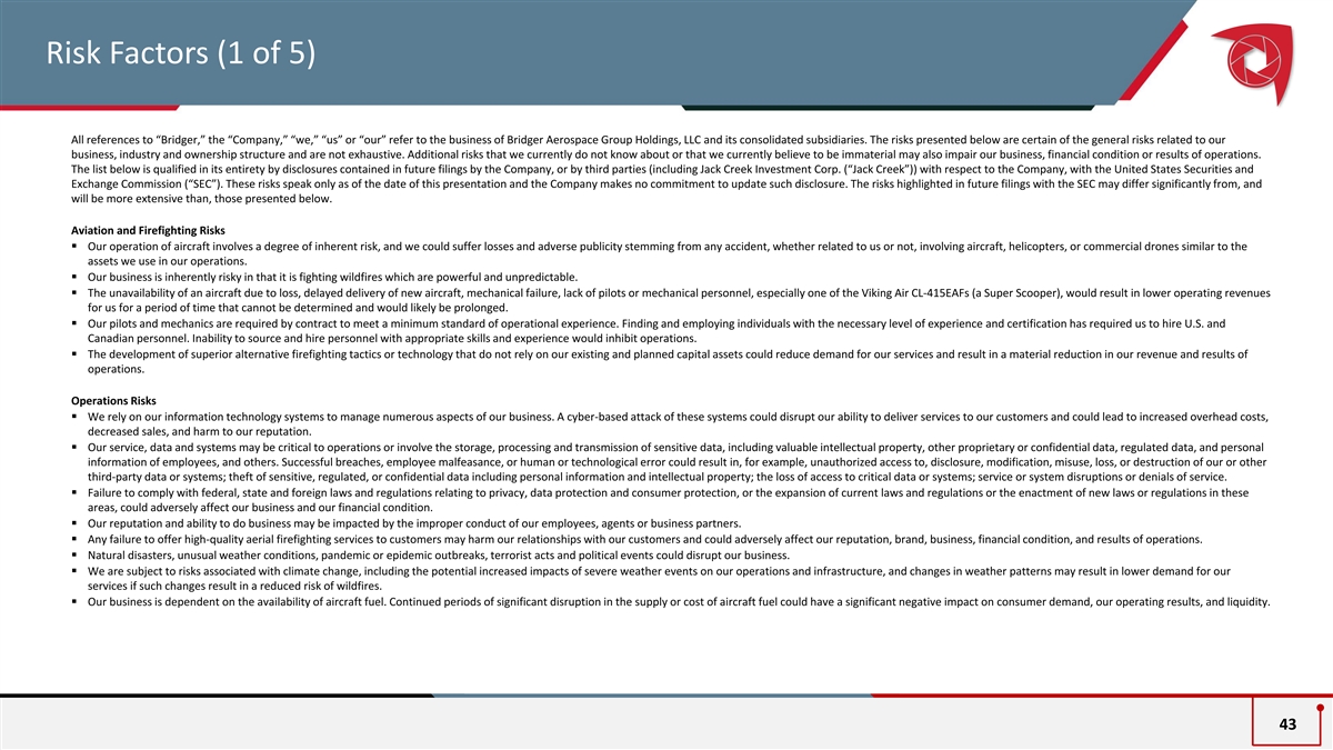 Risk Factors (1 of 5) All references to “Bridger,” the “Company,” “we,” “us” or “our” refer to the business of Bridger Aerospace Group Holdings, LLC and its consolidated subsidiaries. The risks presented below are certain of the general risks related to our business, industry and ownership structure and are not exhaustive. Additional risks that we currently do not know about or that we currently believe to be immaterial may also impair our business, financial condition or results of operations. The list below is qualified in its entirety by disclosures contained in future filings by the Company, or by third parties (including Jack Creek Investment Corp. (“Jack Creek”)) with respect to the Company, with the United States Securities and Exchange Commission (“SEC”). These risks speak only as of the date of this presentation and the Company makes no commitment to update such disclosure. The risks highlighted in future filings with the SEC may differ significantly from, and will be more extensive than, those presented below. Aviation and Firefighting Risks ▪ Our operation of aircraft involves a degree of inherent risk, and we could suffer losses and adverse publicity stemming from any accident, whether related to us or not, involving aircraft, helicopters, or commercial drones similar to the assets we use in our operations. ▪ Our business is inherently risky in that it is fighting wildfires which are powerful and unpredictable. ▪ The unavailability of an aircraft due to loss, delayed delivery of new aircraft, mechanical failure, lack of pilots or mechanical personnel, especially one of the Viking Air CL-415EAFs (a Super Scooper), would result in lower operating revenues for us for a period of time that cannot be determined and would likely be prolonged. ▪ Our pilots and mechanics are required by contract to meet a minimum standard of operational experience. Finding and employing individuals with the necessary level of experience and certification has required us to hire U.S. and Canadian personnel. Inability to source and hire personnel with appropriate skills and experience would inhibit operations. ▪ The development of superior alternative firefighting tactics or technology that do not rely on our existing and planned capital assets could reduce demand for our services and result in a material reduction in our revenue and results of operations. Operations Risks ▪ We rely on our information technology systems to manage numerous aspects of our business. A cyber-based attack of these systems could disrupt our ability to deliver services to our customers and could lead to increased overhead costs, decreased sales, and harm to our reputation. ▪ Our service, data and systems may be critical to operations or involve the storage, processing and transmission of sensitive data, including valuable intellectual property, other proprietary or confidential data, regulated data, and personal information of employees, and others. Successful breaches, employee malfeasance, or human or technological error could result in, for example, unauthorized access to, disclosure, modification, misuse, loss, or destruction of our or other third-party data or systems; theft of sensitive, regulated, or confidential data including personal information and intellectual property; the loss of access to critical data or systems; service or system disruptions or denials of service. ▪ Failure to comply with federal, state and foreign laws and regulations relating to privacy, data protection and consumer protection, or the expansion of current laws and regulations or the enactment of new laws or regulations in these areas, could adversely affect our business and our financial condition. ▪ Our reputation and ability to do business may be impacted by the improper conduct of our employees, agents or business partners. ▪ Any failure to offer high-quality aerial firefighting services to customers may harm our relationships with our customers and could adversely affect our reputation, brand, business, financial condition, and results of operations. ▪ Natural disasters, unusual weather conditions, pandemic or epidemic outbreaks, terrorist acts and political events could disrupt our business. ▪ We are subject to risks associated with climate change, including the potential increased impacts of severe weather events on our operations and infrastructure, and changes in weather patterns may result in lower demand for our services if such changes result in a reduced risk of wildfires. ▪ Our business is dependent on the availability of aircraft fuel. Continued periods of significant disruption in the supply or cost of aircraft fuel could have a significant negative impact on consumer demand, our operating results, and liquidity. 43