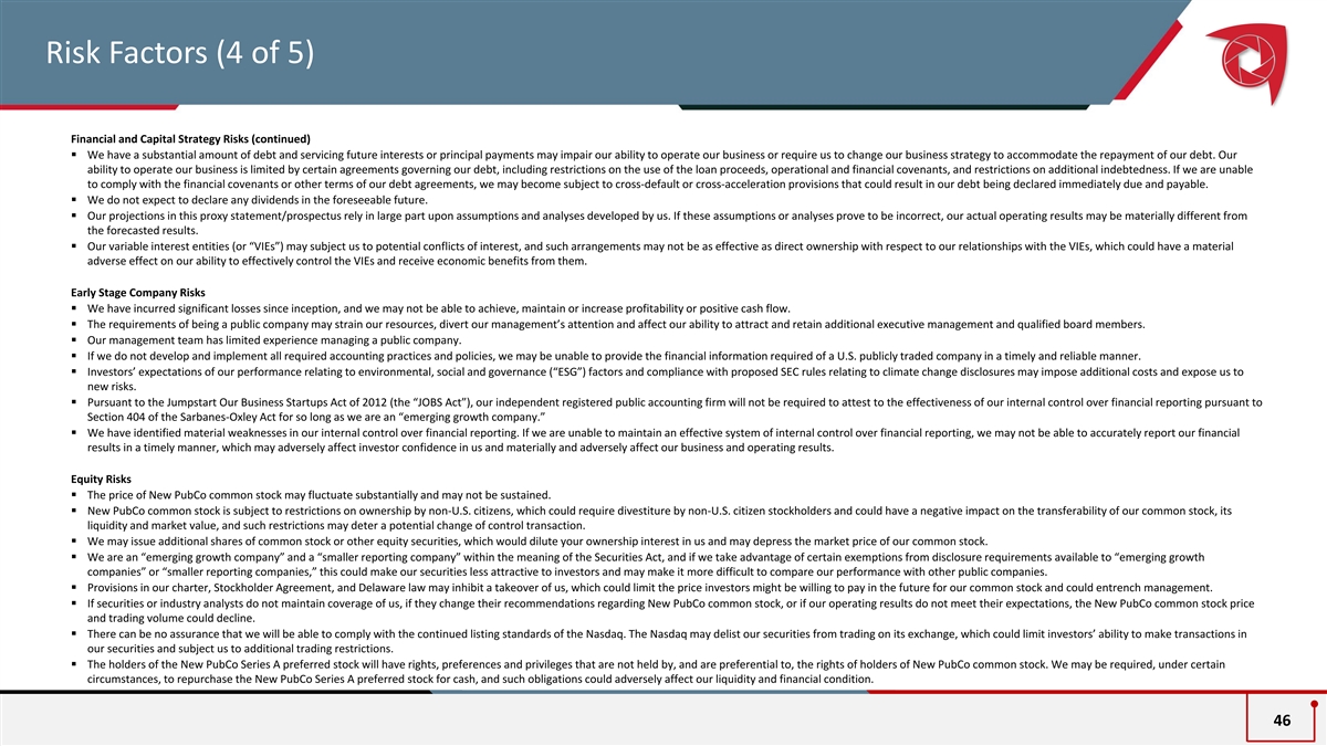 Risk Factors (4 of 5) Financial and Capital Strategy Risks (continued) ▪ We have a substantial amount of debt and servicing future interests or principal payments may impair our ability to operate our business or require us to change our business strategy to accommodate the repayment of our debt. Our ability to operate our business is limited by certain agreements governing our debt, including restrictions on the use of the loan proceeds, operational and financial covenants, and restrictions on additional indebtedness. If we are unable to comply with the financial covenants or other terms of our debt agreements, we may become subject to cross-default or cross-acceleration provisions that could result in our debt being declared immediately due and payable. ▪ We do not expect to declare any dividends in the foreseeable future. ▪ Our projections in this proxy statement/prospectus rely in large part upon assumptions and analyses developed by us. If these assumptions or analyses prove to be incorrect, our actual operating results may be materially different from the forecasted results. ▪ Our variable interest entities (or “VIEs”) may subject us to potential conflicts of interest, and such arrangements may not be as effective as direct ownership with respect to our relationships with the VIEs, which could have a material adverse effect on our ability to effectively control the VIEs and receive economic benefits from them. Early Stage Company Risks ▪ We have incurred significant losses since inception, and we may not be able to achieve, maintain or increase profitability or positive cash flow. ▪ The requirements of being a public company may strain our resources, divert our management’s attention and affect our ability to attract and retain additional executive management and qualified board members. ▪ Our management team has limited experience managing a public company. ▪ If we do not develop and implement all required accounting practices and policies, we may be unable to provide the financial information required of a U.S. publicly traded company in a timely and reliable manner. ▪ Investors’ expectations of our performance relating to environmental, social and governance (“ESG”) factors and compliance with proposed SEC rules relating to climate change disclosures may impose additional costs and expose us to new risks. ▪ Pursuant to the Jumpstart Our Business Startups Act of 2012 (the “JOBS Act”), our independent registered public accounting firm will not be required to attest to the effectiveness of our internal control over financial reporting pursuant to Section 404 of the Sarbanes-Oxley Act for so long as we are an “emerging growth company.” ▪ We have identified material weaknesses in our internal control over financial reporting. If we are unable to maintain an effective system of internal control over financial reporting, we may not be able to accurately report our financial results in a timely manner, which may adversely affect investor confidence in us and materially and adversely affect our business and operating results. Equity Risks ▪ The price of New PubCo common stock may fluctuate substantially and may not be sustained. ▪ New PubCo common stock is subject to restrictions on ownership by non-U.S. citizens, which could require divestiture by non-U.S. citizen stockholders and could have a negative impact on the transferability of our common stock, its liquidity and market value, and such restrictions may deter a potential change of control transaction. ▪ We may issue additional shares of common stock or other equity securities, which would dilute your ownership interest in us and may depress the market price of our common stock. ▪ We are an “emerging growth company” and a “smaller reporting company” within the meaning of the Securities Act, and if we take advantage of certain exemptions from disclosure requirements available to “emerging growth companies” or “smaller reporting companies,” this could make our securities less attractive to investors and may make it more difficult to compare our performance with other public companies. ▪ Provisions in our charter, Stockholder Agreement, and Delaware law may inhibit a takeover of us, which could limit the price investors might be willing to pay in the future for our common stock and could entrench management. ▪ If securities or industry analysts do not maintain coverage of us, if they change their recommendations regarding New PubCo common stock, or if our operating results do not meet their expectations, the New PubCo common stock price and trading volume could decline. ▪ There can be no assurance that we will be able to comply with the continued listing standards of the Nasdaq. The Nasdaq may delist our securities from trading on its exchange, which could limit investors’ ability to make transactions in our securities and subject us to additional trading restrictions. ▪ The holders of the New PubCo Series A preferred stock will have rights, preferences and privileges that are not held by, and are preferential to, the rights of holders of New PubCo common stock. We may be required, under certain circumstances, to repurchase the New PubCo Series A preferred stock for cash, and such obligations could adversely affect our liquidity and financial condition. 46