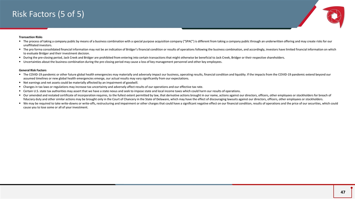 Risk Factors (5 of 5) Transaction Risks ▪ The process of taking a company public by means of a business combination with a special purpose acquisition company (“SPAC”) is different from taking a company public through an underwritten offering and may create risks for our unaffiliated investors. ▪ The pro forma consolidated financial information may not be an indication of Bridger’s financial condition or results of operations following the business combination, and accordingly, investors have limited financial information on which to evaluate Bridger and their investment decision. ▪ During the pre-closing period, Jack Creek and Bridger are prohibited from entering into certain transactions that might otherwise be beneficial to Jack Creek, Bridger or their respective shareholders. ▪ Uncertainties about the business combination during the pre-closing period may cause a loss of key management personnel and other key employees. General Risk Factors ▪ The COVID-19 pandemic or other future global health emergencies may materially and adversely impact our business, operating results, financial condition and liquidity. If the impacts from the COVID-19 pandemic extend beyond our assumed timelines or new global health emergencies emerge, our actual results may vary significantly from our expectations. ▪ Net earnings and net assets could be materially affected by an impairment of goodwill. ▪ Changes in tax laws or regulations may increase tax uncertainty and adversely affect results of our operations and our effective tax rate. ▪ Certain U.S. state tax authorities may assert that we have a state nexus and seek to impose state and local income taxes which could harm our results of operations. ▪ Our amended and restated certificate of incorporation requires, to the fullest extent permitted by law, that derivative actions brought in our name, actions against our directors, officers, other employees or stockholders for breach of fiduciary duty and other similar actions may be brought only in the Court of Chancery in the State of Delaware, which may have the effect of discouraging lawsuits against our directors, officers, other employees or stockholders. ▪ We may be required to take write-downs or write-offs, restructuring and impairment or other charges that could have a significant negative effect on our financial condition, results of operations and the price of our securities, which could cause you to lose some or all of your investment. 47