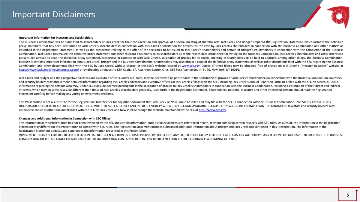 Important Disclaimers Important Information for Investors and Stockholders The Business Combination will be submitted to shareholders of Jack Creek for their consideration and approval at a special meeting of shareholders. Jack Creek and Bridger prepared the Registration Statement, which includes the definitive proxy statement that has been distributed to Jack Creek’s shareholders in connection with Jack Creek’s solicitation for proxies for the vote by Jack Creek’s shareholders in connection with the Business Combination and other matters as described in the Registration Statement, as well as the prospectus relating to the offer of the securities to be issued to Jack Creek’s shareholders and certain of Bridger’s equityholders in connection with the completion of the Business Combination. Jack Creek has mailed the definitive proxy statement and other relevant documents to its shareholders as of the record date established for voting on the Business Combination. Jack Creek’s shareholders and other interested persons are advised to read the definitive proxy statement/prospectus in connection with Jack Creek’s solicitation of proxies for its special meeting of shareholders to be held to approve, among other things, the Business Combination, because it contains important information about Jack Creek, Bridger and the Business Combination. Shareholders may also obtain a copy of the definitive proxy statement, as well as other documents filed with the SEC regarding the Business Combination and other documents filed with the SEC by Jack Creek, without charge, at the SEC’s website located at www.sec.gov. Copies of these filings may be obtained free of charge on Jack Creek’s “Investor Relations” website at https://www.jackcreekinvestmentcorp.com/ or by directing a request to KSH Capital LP, Attention: Lauren Ores, 386 Park Avenue South, FL 20, New York, NY 10016. Jack Creek and Bridger and their respective directors and executive officers, under SEC rules, may be deemed to be participants in the solicitation of proxies of Jack Creek’s shareholders in connection with the Business Combination. Investors and security holders may obtain more detailed information regarding Jack Creek’s directors and executive officers in Jack Creek’s filings with the SEC, including Jack Creek’s Annual Report on Form 10-K filed with the SEC on March 21, 2022. Information regarding the persons who may, under SEC rules, be deemed participants in the solicitation of proxies to Jack Creek’s shareholders in connection with the Business Combination, including a description of their direct and indirect interests, which may, in some cases, be different than those of Jack Creek’s shareholders generally, is set forth in the Registration Statement. Shareholders, potential investors and other interested persons should read the Registration Statement carefully before making any voting or investment decisions. This Presentation is not a substitute for the Registration Statement or for any other document that Jack Creek or New PubCo has filed and may file with the SEC in connection with the Business Combination. INVESTORS AND SECURITY HOLDERS ARE URGED TO READ THE DOCUMENTS FILED WITH THE SEC CAREFULLY AND IN THEIR ENTIRETY WHEN THEY BECOME AVAILABLE BECAUSE THEY WILL CONTAIN IMPORTANT INFORMATION. Investors and security holders may obtain free copies of other documents filed with the SEC by Jack Creek and New PubCo through the website maintained by the SEC at http://www.sec.gov. Changes and Additional Information in Connection with SEC Filings The information in this Presentation has not been reviewed by the SEC and certain information, such as financial measures referenced herein, may not comply in certain respects with SEC rules. As a result, the information in the Registration Statement may differ from this Presentation to comply with SEC rules. The Registration Statement includes substantial additional information about Bridger and Jack Creek not contained in this Presentation. The information in the Registration Statement updates and supersedes the information presented in this Presentation. INVESTMENT IN ANY SECURITIES DESCRIBED HEREIN HAS NOT BEEN APPROVED OR DISAPPROVED BY THE SEC OR ANY OTHER REGULATORY AUTHORITY NOR HAS ANY AUTHORITY PASSED UPON OR ENDORSED THE MERITS OF THE BUSINESS COMBINATION OR THE ACCURACY OR ADEQUACY OF THE INFORMATION CONTAINED HEREIN. ANY REPRESENTATION TO THE CONTRARY IS A CRIMINAL OFFENSE. 5