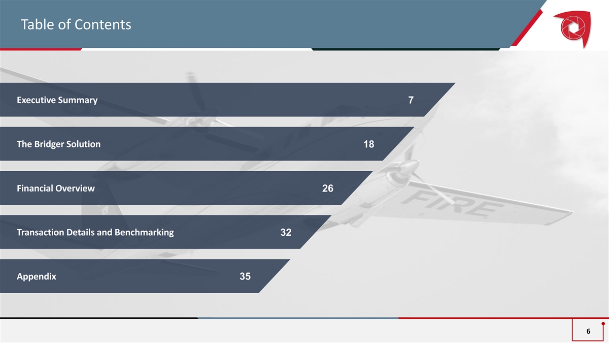 Table of Contents Table of Contents Executive Summary 7 The Bridger Solution 18 Financial Overview 26 Transaction Details and Benchmarking 32 Appendix 35 6