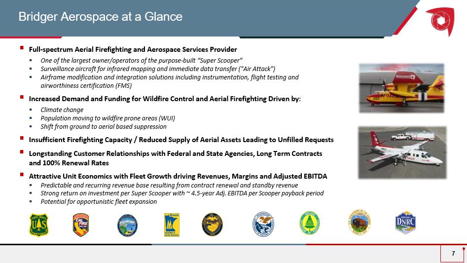 Bridger Aerospace Milestones 6 Founded as a veteran - owned business in 2014 Awarded Multi Year DOI Special Sensor Surveillance Contract for up to $68 million and 10 - year Air Attack contract with the Forest Service for up to $166 million NASDAQ listed in Q1’23 Received first two “Super Scoopers” in 2020 Source: Bridger management. Entered partnership to acquire four Spanish Scoopers and Secured Air Attack contract with the DOI for the state of Alaska for up to $20.1 m illion Acquired Ignis Technologies Acquired Added sixth “Super Scooper” in 2023 First Air Attack Missions with three Twin Commanders in 2015
