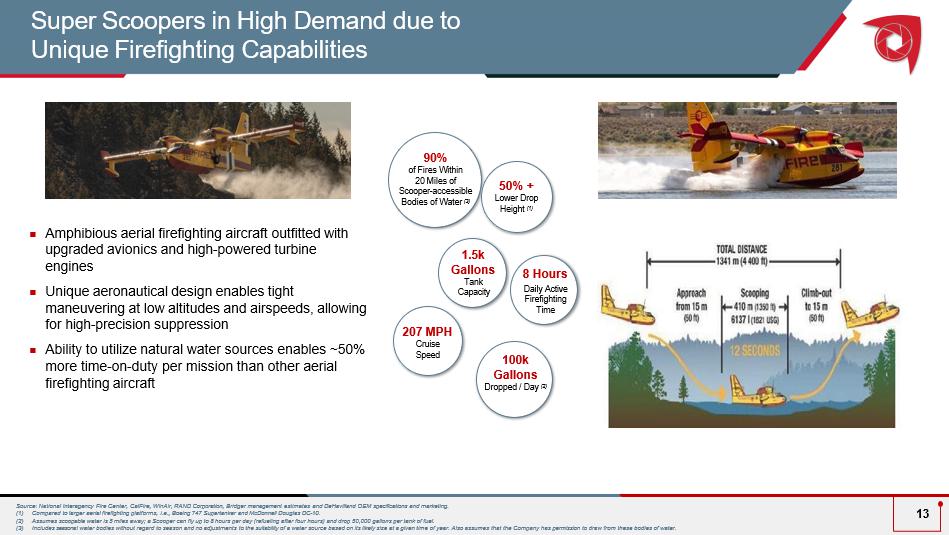 Full Spectrum Aerial Firefighting Solution ▪ Suppression Aircraft (6 ) ▪ Purpose built DeHavilland “Super Scoopers” ▪ Highly capable and cost - efficient ▪ Track - record of safety and reliability ▪ High return on investment ▪ Air Attack and Surveillance ▪ Daher Kodiak 100 (4) and Pilatus PC - 12 (2) ▪ C ommand and control over a fire ▪ High reliability ▪ Special Missions (MMA) ▪ Pilatus PC - 12 (2) and Shrike Commander 500S (1) ▪ Cutting edge imaging systems and data transmission ▪ Advanced technologies lead to improved margins 12 Bridger Aerospace Deploys a Modern, Efficient Fleet that Integrates Data, Analytics and Reporting to Optimize Deployment in Order to Combat the Economic and Environmental Threat of Wildfires