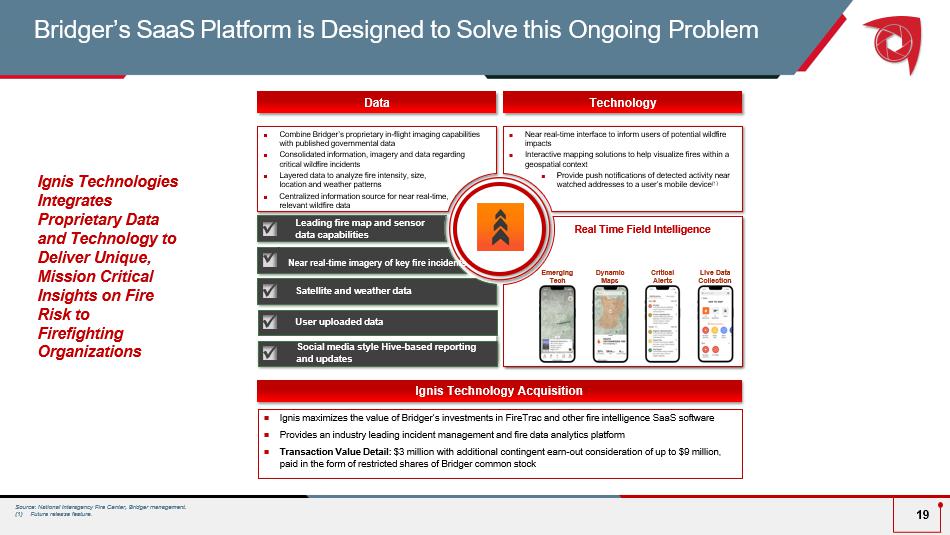 Ignis Technologies Integrates Proprietary Data and Technology to Deliver Unique, Mission Critical Insights on Fire Risk to Firefighting Organizations Bridger’s SaaS Platform is Designed to Solve this Ongoing Problem 19 Combine Bridger’s proprietary in - flight imaging capabilities with published governmental data Consolidated information, imagery and data regarding critical wildfire incidents Layered data to analyze fire intensity, size, location and weather patterns Centralized information source for near real - time, relevant wildfire data Near real - time interface to inform users of potential wildfire impacts Interactive mapping solutions to help visualize fires within a geospatial context Provide push notifications of detected activity near watched addresses to a user’s mobile device (1) Leading fire map and sensor data capabilities Satellite and weather data User uploaded data Data Technology x x x Near real - time imagery of key fire incidents x x Ignis maximizes the value of Bridger’s investments in FireTrac and other fire intelligence SaaS software Provides an industry leading incident management and fire data analytics platform Transaction Value Detail: $3 million with additional contingent earn - out consideration of up to $9 million, paid in the form of restricted shares of Bridger common stock Ignis Technology Acquisition Real Time Field Intelligence Live Data Collection Dynamic Maps Critical Alerts Emerging Tech Source: National Interagency Fire Center, Bridger management. (1) Future release feature. x Social media style Hive - based reporting and updates