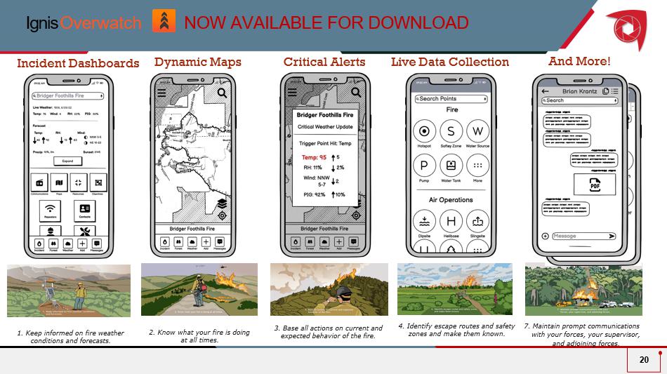 Dynamic Maps Critical Alerts Live Data Collection 1. Keep informed on fire weather conditions and forecasts. 2. Know what your fire is doing at all times. 3. Base all actions on current and expected behavior of the fire. 4. Identify escape routes and safety zones and make them known. 7. Maintain prompt communications with your forces, your supervisor, and adjoining forces. Incident Dashboards And More! Ignis Overwatch NOW AVAILABLE FOR DOWNLOAD 20