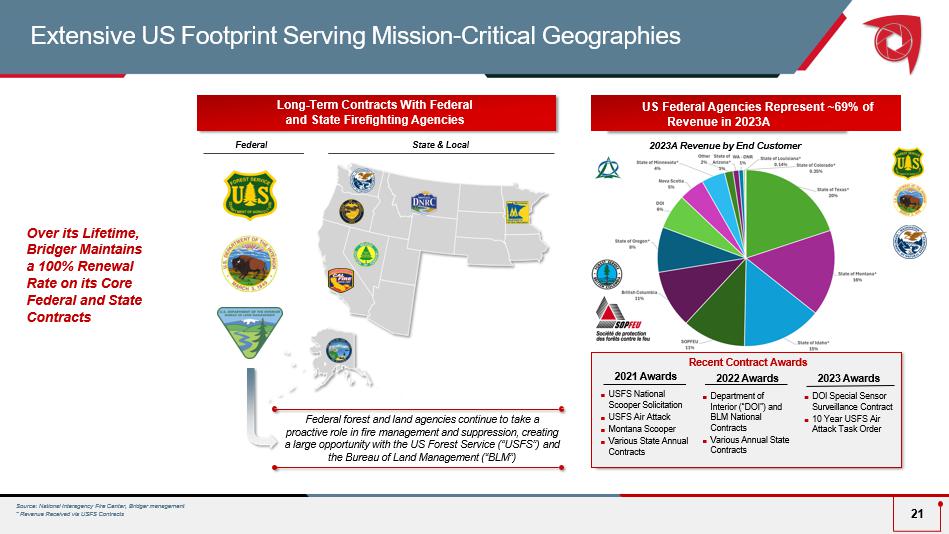 Long - Term Contracts With Federal and State Firefighting Agencies Federal State & Local Federal forest and land agencies continue to take a proactive role in fire management and suppression, creating a large opportunity with the US Forest Service (“USFS”) and the Bureau of Land Management (“BLM”) Over its Lifetime, Bridger Maintains a 100% Renewal Rate on its Core Federal and State Contracts Source: National Interagency Fire Center, Bridger managemen t * Revenue Received via USFS Contracts Extensive US Footprint Serving Mission - Critical Geogra phies 21 US Federal Agencies Represent ~69% of Revenue in 2023A 202 3A Revenue by End Customer 2021 Awards USFS National Scooper Solicitation USFS Air Attack Montana Scooper Various State Annual Contracts 2022 Awards Department of Interior (“DOI”) and BLM National Contracts Various Annual State Contracts Recent Contract Awards 2023 Awards DOI Special Sensor Surveillance Contract 10 Year USFS Air Attack Task Order