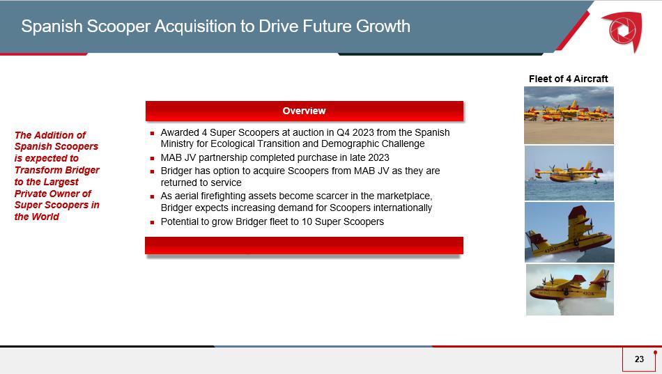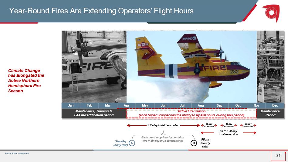 Awarded 4 Super Scoopers at auction in Q4 2023 from the Spanish Ministry for Ecological Transition and Demographic Challenge MAB JV partnership completed purchase in late 2023 Bridger has option t o acquire Scoopers from MAB JV as they are returned to service As aerial firefighting assets become scarcer in the marketplace, Bridger expects increasing demand for Scoopers internationally Potential to grow Bridger fleet to 10 Super Scoopers Spanish Scooper Acquisition to Drive Future Growth 23 Fleet of 4 Aircraft Overview The Addition of Spanish Scoopers is expected to Transform Bridger to the Largest Private Owner of Super Scoopers in the World