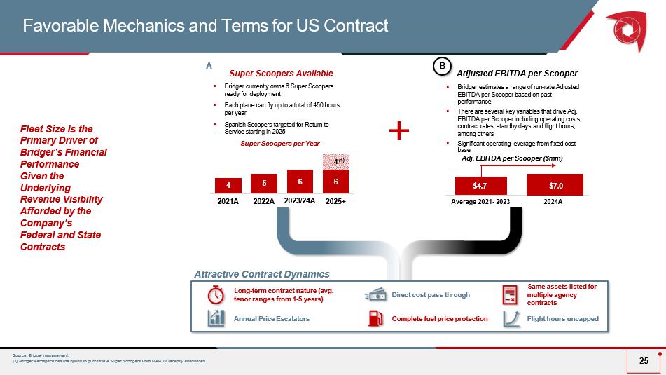 A B Super Scoopers Available ▪ Bridger currently owns 6 Super Scoopers ready for deployment ▪ Each plane can fly up to a total of 450 hours per year ▪ Spanish Scoopers targeted for Return to Service starting in 2025 Long - term contract nature (avg. tenor ranges from 1 - 5 years) Annual Price Escalators Direct cost pass through Complete fuel price protection Same assets listed for multiple agency contracts Flight hours uncapped Favorable Mechanics and Terms for US Contract 25 Fleet Size Is the Primary Driver of Bridger’s Financial Performance Given the Underlying Revenue Visibility Afforded by the Company’s Federal and State Contracts Super Scoopers per Year Attractive Contract Dynamics Adjusted EBITDA per Scooper ▪ Bridger estimates a range of run - rate Adjusted EBITDA per Scooper based on past performance ▪ There are several key variables that drive Adj. EBITDA per Scooper including operating costs, contract rates, standby days and flight hours, among others ▪ Significant operating leverage from fixed cost base Adj. EBITDA per Scooper ($mm) 4 5 6 6 4 2021A 2022A 2023 /24 A 202 5 + ( 1 ) $ 4.7 $ 7.0 Average 2021 - 2023 2024 A Source: Bridger management. (1) Bridger Aerospace has the option to purchase 4 Super Scoopers from MAB JV recently announced.