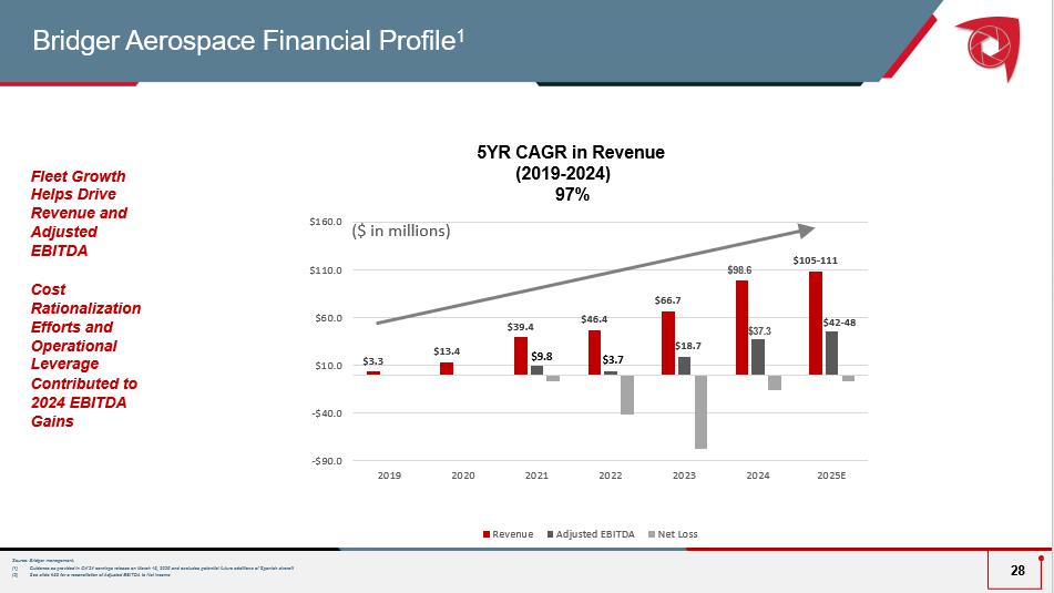 $3.3 $13.4 $39.4 $46.4 $66.7 $105 - 111 $18.7 $42 - 48 -$90.0 -$40.0 $10.0 $60.0 $110.0 $160.0 2019 2020 2021 2022 2023 2024 2025E ($ in millions) Revenue Adjusted EBITDA Net Loss Source: Bridger management. (1) Guidance as provided in Q4’24 earnings release on March 13, 2025 and excludes potential future additions of Spanish aircraft (2) See slide #33 for a reconciliation of Adjusted EBITDA to Net Income Fleet Growth Helps Drive Revenue and Adjusted EBITDA Cost Rationalization Efforts and Operational Leverage Contributed to 2024 EBITDA Gains Bridger Aerospace Financial Profile 1 $ 98.6 $37.3 28 5YR CAGR in Revenue (2019 - 2024) 97% $9.8 $3.7