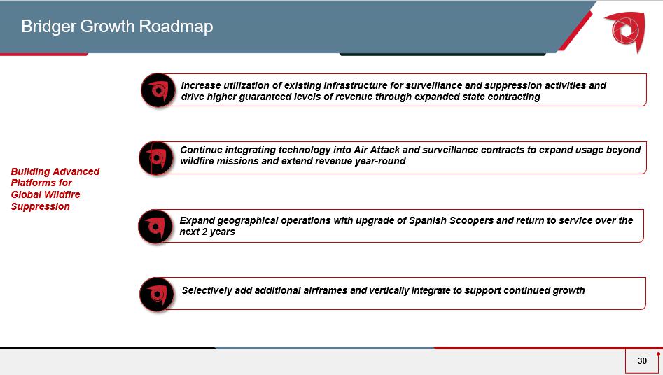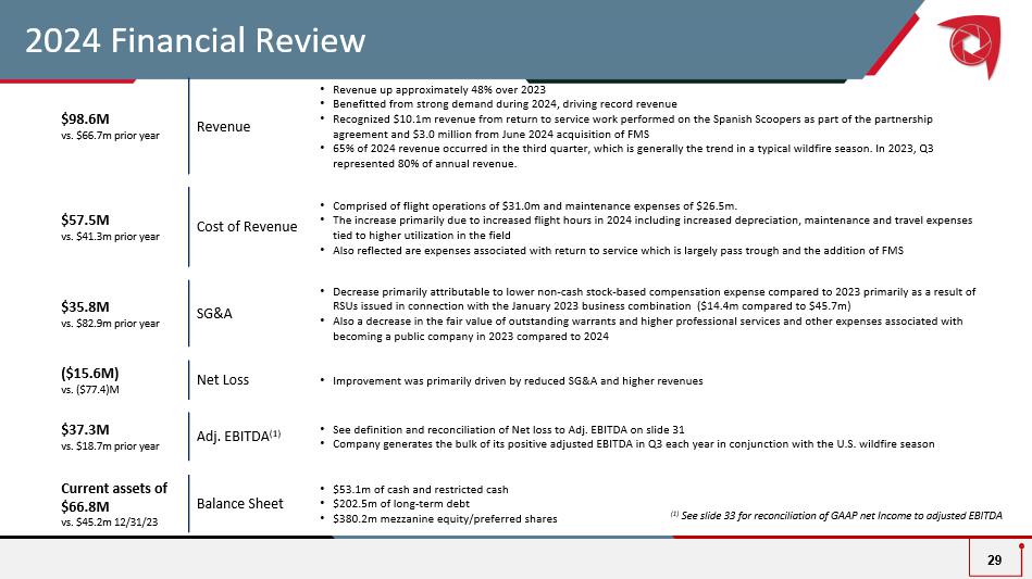2024 Financial Review • Revenue up approximately 48% over 2023 • Benefitted from strong demand during 2024, driving record revenue • Recognized $10.1m revenue from return to service work performed on the Spanish Scoopers as part of the partnership agreement and $3.0 million from June 2024 acquisition of FMS • 65% of 2024 revenue occurred in the third quarter, which is generally the trend in a typical wildfire season. In 2023, Q3 represented 80% of annual revenue. Revenue $98.6M vs. $66.7m prior year • Comprised of flight operations of $31.0m and maintenance expenses of $26.5m. • The increase primarily due to increased flight hours in 2024 including increased depreciation, maintenance and travel expense s tied to higher utilization in the field • Also reflected are expenses associated with return to service which is largely pass trough and the addition of FMS Cost of Revenue $57.5M vs. $41.3m prior year • Decrease primarily attributable to lower non - cash stock - based compensation expense compared to 2023 primarily as a result of RSUs issued in connection with the January 2023 business combination ($14.4m compared to $45.7m) • Also a decrease in the fair value of outstanding warrants and higher professional services and other expenses associated with becoming a public company in 2023 compared to 2024 SG&A $35.8M vs. $82.9m prior year • Improvement was primarily driven by reduced SG&A and higher revenues Net Loss ($15.6M) vs. ($77.4)M • See definition and reconciliation of Net loss to Adj. EBITDA on slide 31 • Company generates the bulk of its positive adjusted EBITDA in Q3 each year in conjunction with the U.S. wildfire season Adj. EBITDA (1) $37.3M vs. $18.7m prior year • $53.1m of cash and restricted cash • $202.5m of long - term debt • $380.2m mezzanine equity/preferred shares Balance Sheet Current assets of $66.8M vs. $45.2m 12/31/23 29 (1) See slide 33 for reconciliation of GAAP net Income to adjusted EBITDA