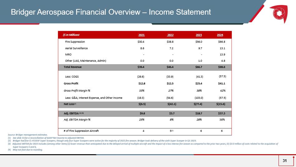 Bridger Growth Roadmap 30 Increase utilization of existing infrastructure for surveillance and suppression activities and drive higher guaranteed levels of revenue through expanded state contracting B uilding Advanced Platforms for Global Wildfire Suppression Expand geographical operations with upgrade of Spanish Scoopers and return to service over the next 2 years Selectively add additional airframes and vertically integrate to support continued growth Continue integrating technology into Air Attack and surveillance contracts to expand usage beyond wildfire missions and extend revenue year - round