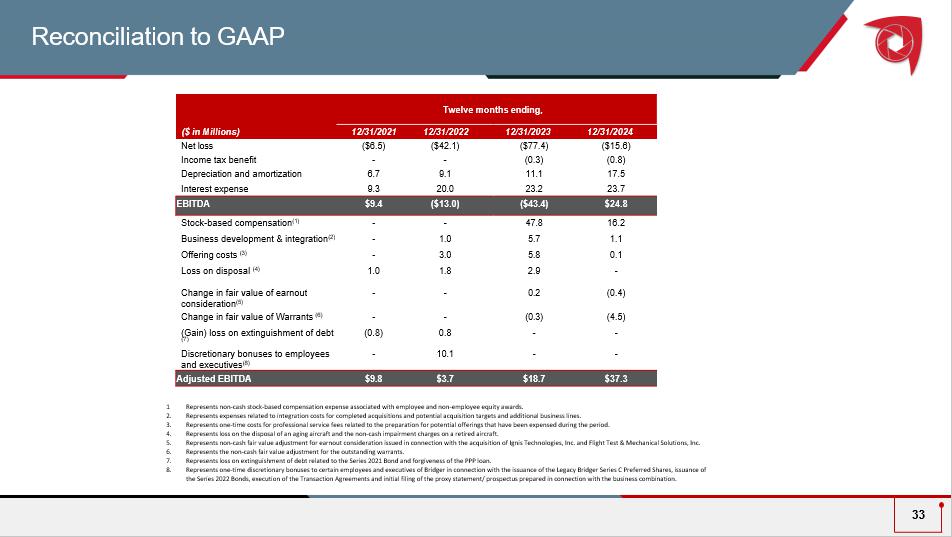 Twelve months ending, 12/31/2024 12/31/2023 12/31/2022 12/31/202 1 ($ in Millions ) ($15.6) ($ 77.4 ) ($42.1) ($ 6.5 ) Net loss (0.8) (0.3) - - Income tax benefit 17.5 11.1 9.1 6.7 Depreciation and a mortization 23.7 23.2 20.0 9.3 Interest e xpense $24.8 ( $ 43.4) ($13.0) $9.4 EBITDA 16.2 47.8 - - Stock - based compensation (1) 1.1 5.7 1.0 - Business development & integration (2) 0.1 5.8 3.0 - Offering costs (3) - 2.9 1.8 1.0 L oss on disposal (4) (0.4) 0.2 - - Change in fair value of earnout consideration (5) (4.5) (0.3) - - Change in fair value of Warrants (6) - - 0.8 (0.8) (Gain) loss on extinguishment of debt (7) - - 10.1 - Discretionary bonuses to employees and executives ( 8 ) $37.3 $ 18.7 $3.7 $ 9.8 Adj usted EBITDA Reconciliation to GAAP 33 1 Represents non - cash stock - based compensation expense associated with employee and non - employee equity awards. 2. Represents expenses related to integration costs for completed acquisitions and potential acquisition targets and additional bus iness lines. 3. Represents one - time costs for professional service fees related to the preparation for potential offerings that have been exp ensed during the period. 4. Represents loss on the disposal of an aging aircraft and the non - cash impairment charges on a retired aircraft. 5. Represents non - cash fair value adjustment for earnout consideration issued in connection with the acquisition of Ignis Techno logies, Inc. and Flight Test & Mechanical Solutions, Inc. 6. Represents the non - cash fair value adjustment for the outstanding warrants. 7. Represents loss on extinguishment of debt related to the Series 2021 Bond and forgiveness of the PPP loan. 8. Represents one - time discretionary bonuses to certain employees and executives of Bridger in connection with the issuance of the Legacy Bridger Series C Preferred Shares, issuance of the Series 2022 Bonds, execution of the Transaction Agreements and initial filing of the proxy statement/ prospectus prepared in connection with the business combination.